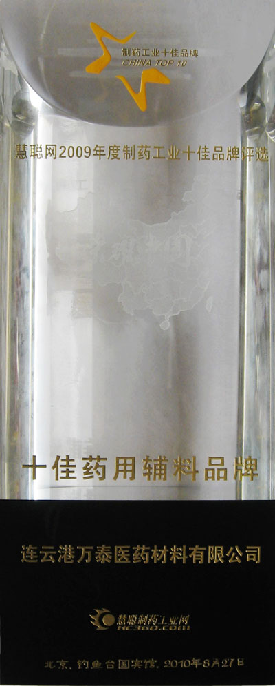 十佳藥用輔料品牌獎杯